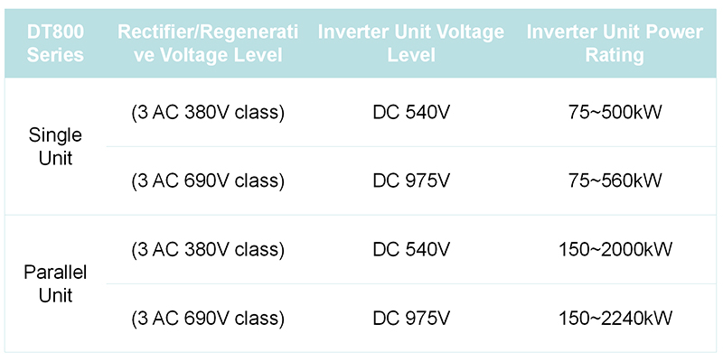 Серия DTS800 поддерживает конфигурации как с одним, так и с несколькими приводами. Она также позволяет нескольким инверторам работать параллельно для питания одного двигателя, обеспечивая масштабируемую мощность за счет параллельной работы. Серия доступна в двух классах напряжения — трёхфазное переменное напряжение 380 В и 690 В переменного тока — и охватывает широкий диапазон мощности от 75 до 2240 кВт.